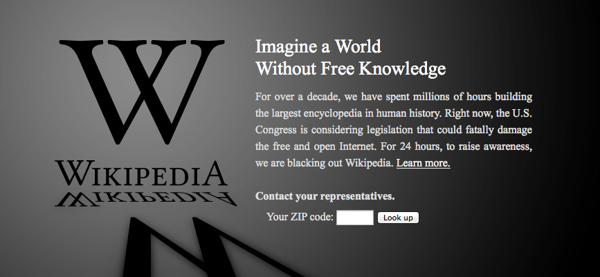 Today, major sites like Wikipedia and Reddit chose the “internet nuclear option” and blacked out their sites for a day in protest of two bills making their way through Congress: The Stop Online Piracy Act (SOPA) and the Protect IP Act (PIPA).