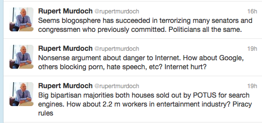 On a more serious note, there are many organizations still supporting SOPA/PIPA. At press time, none of the major players listed as supporters issued an updated statement about the legislation. But companies like Walt Disney, NBCUniversal, CBS, The American Association of Publishers, Phillip Morris, Viacom, and Xerox are still listed as supporters. Media mogul Rupert Murdoch is one of the most vocal supporters, taking to Twitter to air his feelings: