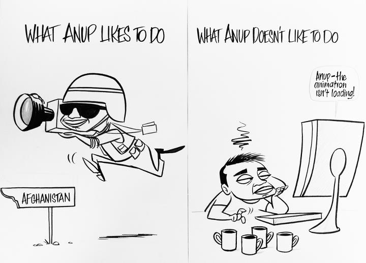 The numbers of inspiring examples abound. I look around me and see people like my friend and fellow Columbia graduate Anup Kaphle of The Washington Post. He has received funding from a number of organizations to tell some amazing stories from Afghanistan even though his full-time job is more of an office job. Throughout the years, he has carved out a beat for himself in Afghanistan — not to mention the respect from his colleagues, as shown in this cartoon by Pulitzer Prize-winning animated cartoonist Ann Telnaes: