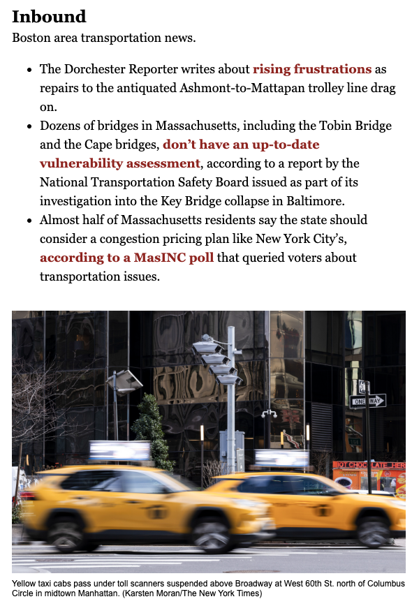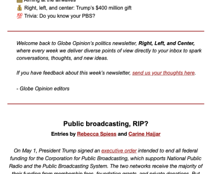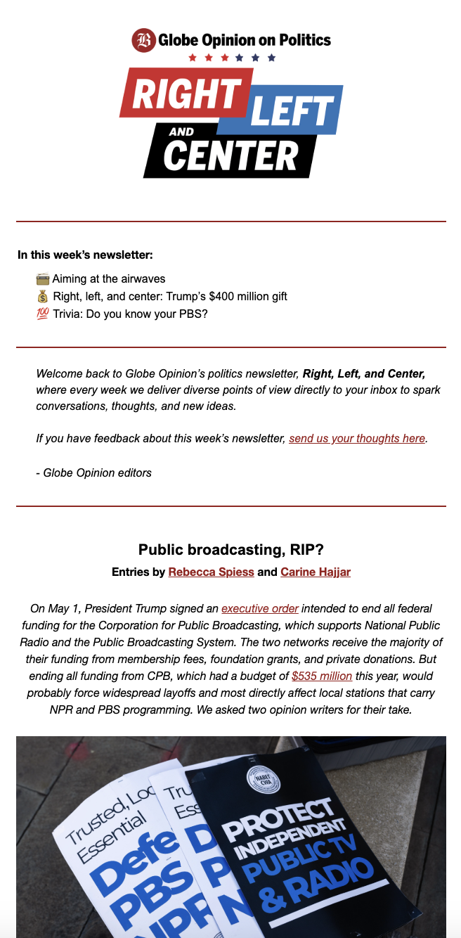 Our other two newsletters are more beat oriented. Are we there yet, written by our deputy editorial page editor Alan Wirzbicki, started out as a short-term newsletter about a transit shut down in 2023. But readers engaged with it so enthusiastically that we decided to keep it going, expanding its writ to include all forms of transportation. Similarly, our politics newsletter began as a way to cover the 2024 primaries (it was called, appropriately enough, Primary Source.) But it too proved popular enough with both writers and readers that we decided to rebrand it Right, Left, and Center, and extend it into 2025 to cover the start of the Trump administration and the Boston mayor’s race.