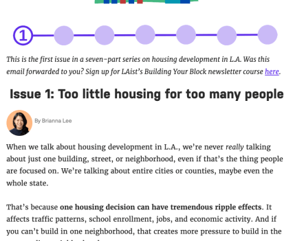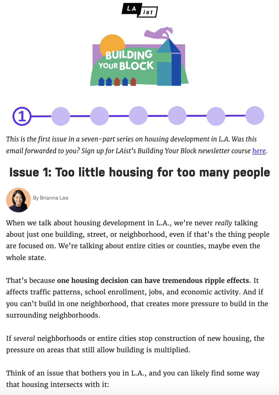 That’s where Building Your Block comes in. This seven-issue newsletter series zooms out on the housing conversations L.A is having so that readers better understand where individual laws, policy changes or controversies fit into the larger picture.