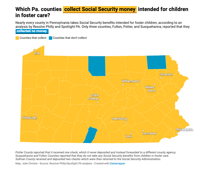 Counties across Pennsylvania are taking millions of dollars in Social Security benefits owed to kids in foster care, a practice some child advocates equate to stealing.