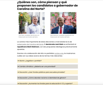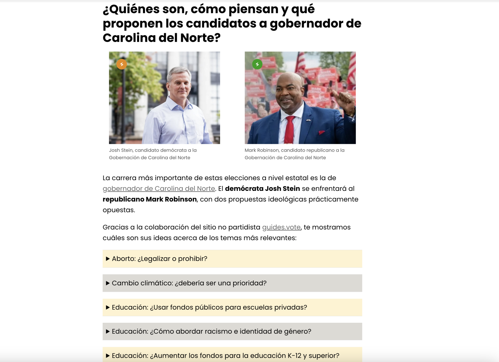 In collaboration with Guides.Vote, we also published nonpartisan candidate comparisons on issues that matter most to our readers. These resources—never before available in Spanish in North Carolina—helped residents cast informed votes in races from president to the state legislature. The impact was direct: first-time voters told us the guides empowered them to participate. We distributed 7,000 printed copies of our general election guide at community events, and engagement metrics showed high online usage leading up to the elections.