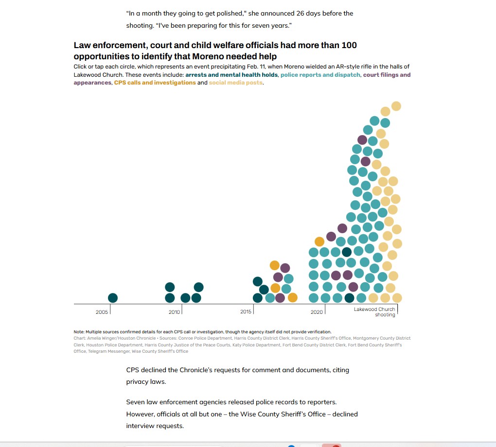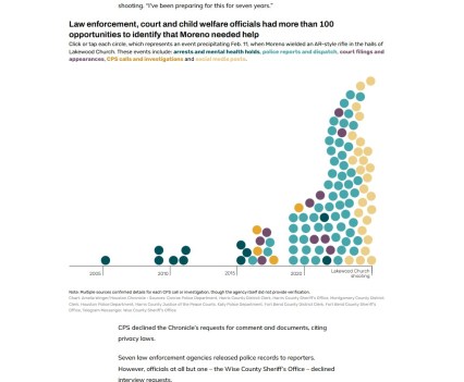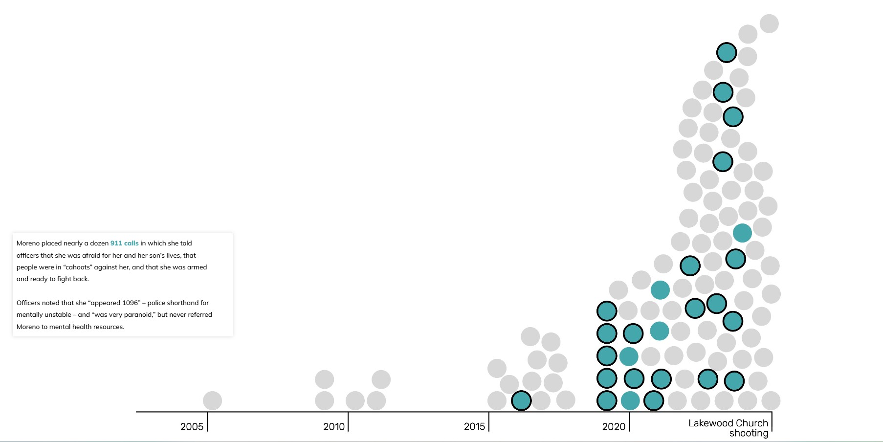 Reporters collected dozens of recorded 911 calls and hundreds of pages of law enforcement reports and court filings to build a first-of-its-kind database of every interaction that Genesse Moreno, the shooter, had with government authorities in the decade leading up to the deadly attack. A monthslong analysis – informed by interviews with Moreno’s family members, friends and neighbors, government officials, and criminal justice, mental health and child welfare law experts – pinpoints more than 100 missed opportunities where authorities could have intervened.