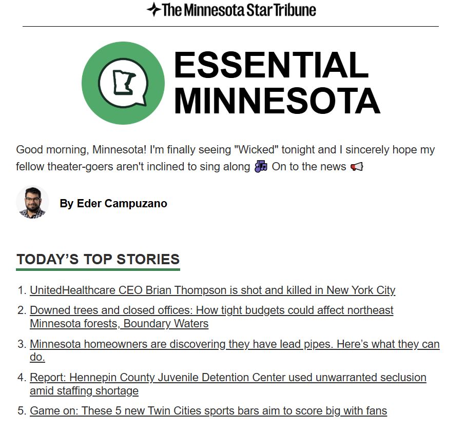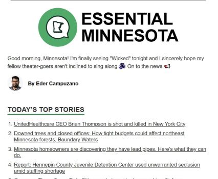 PRODUCTS: We launched a hallmark morning newsletter that is now our most popular: Essential Minnesota. Likewise, as we expanded our coverage throughout Minnesota, we launched and revamped newsletters for each region — from Duluth to Mankato – hand-crafted by the reporters living in those communities. Meanwhile, we expanded our social media presence and audience across all of our coverage, from sports to investigations, from breaking news to pop culture.