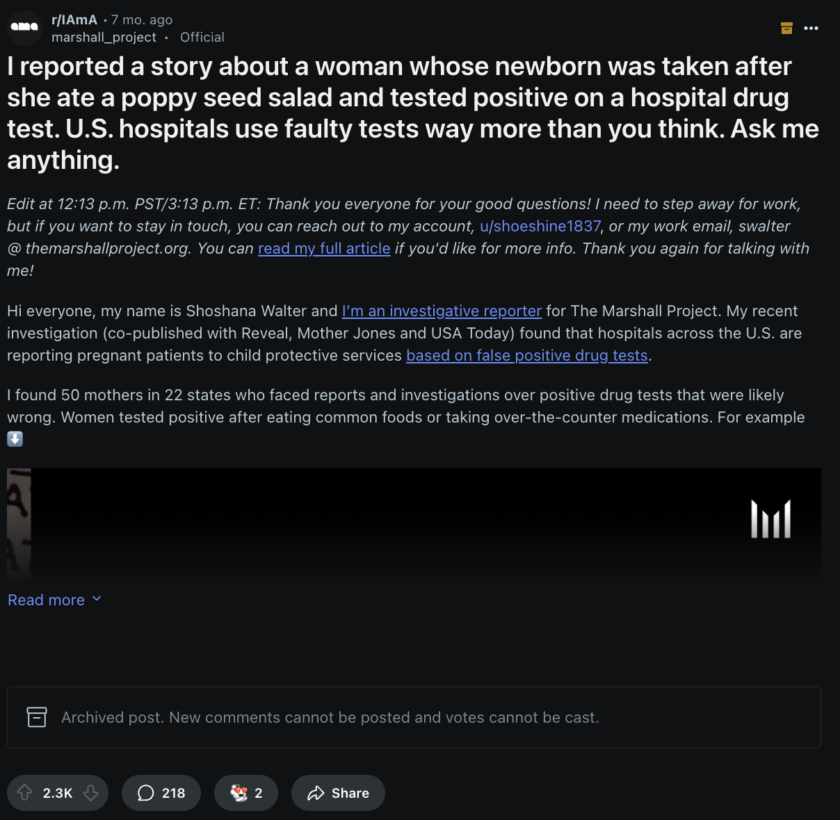 Audience Engagement Producer Kristin Bausch designed in-depth explainer carousels to break down both stories through text, audio and visuals, weaving Walter’s big-picture takeaways with her narrative storytelling. Walter also experimented with video storytelling under the direction of Audience Engagement Producer Chris Vazquez, who used visual props to accompany Walter’s scripted lines. In a second social video, Vazquez took another approach in scripting, starring and producing a sketch-based video to share Walter’s reporting takeaways. And on Reddit, Audience Director Ashley Dye posted the stories in subreddits while noticing Redditors’ organic shares and conversations — vast platform interest that spurred Dye to produce an AMA with Walter.