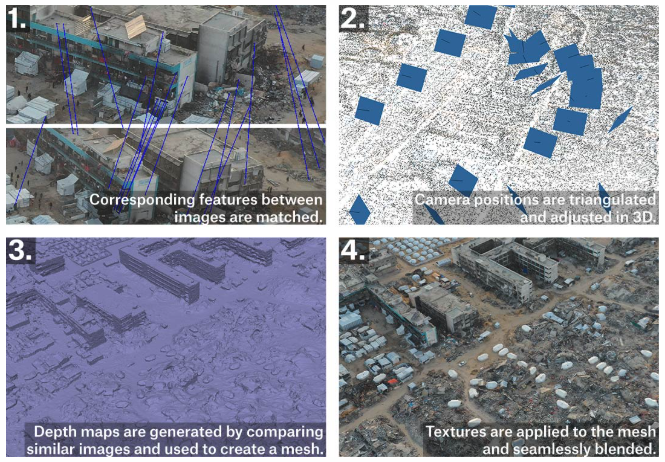 The 3D models were created from the drone photos in four steps. First, corresponding features were detected and matched between images. Then, using the corresponding features, camera positions were triangulated using the camera parameters (ie. focal length, pixel size, lens distortion) and repeatedly adjusted to increase the accuracy of the reconstructed camera positions through bundle block adjustment. Next, depth maps were created for each image using dense stereo matching, which compares images from similar viewpoints to find the small differences between them caused by parallax. These depth maps were then used to create a 3D mesh that serves as an accurate recreation of Gaza. Finally, a texture was created by projecting the original drone photos onto the mesh in a way that seamlessly blends them, giving the final result of a photorealistic and dimensionally accurate 3D model.