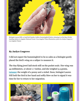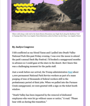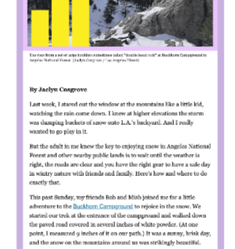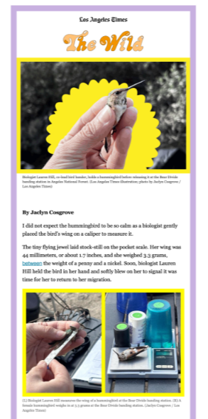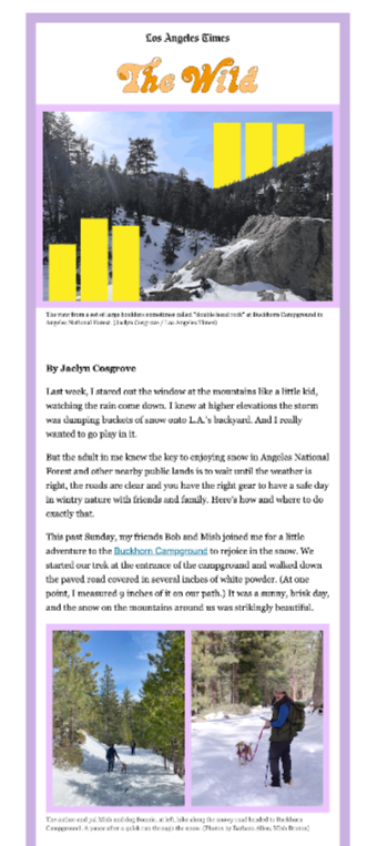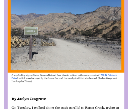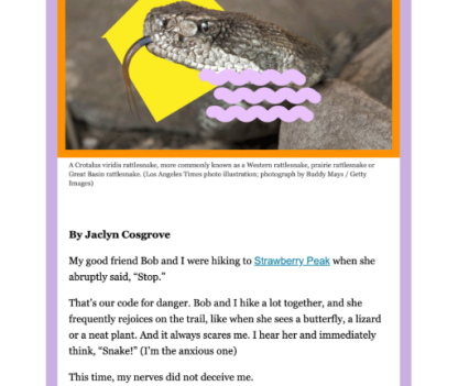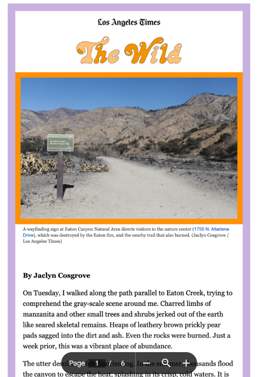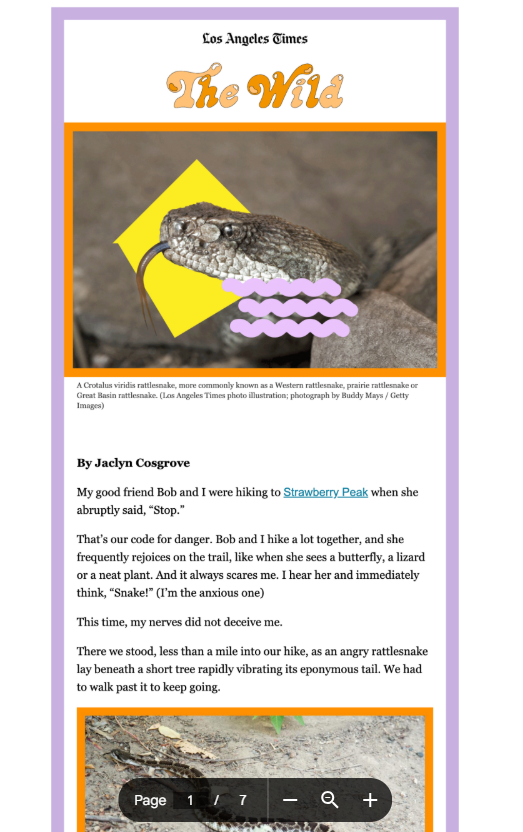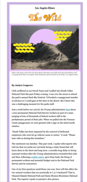 Los Angeles is within driving distance of many a trail, campsite and park. The Wild functions as a guide for the city’s enthusiastic urban outdoor community, highlighting ways to explore, learn about and co-exist with their natural surroundings. The weekly dispatch, written from the first-person perspective of outdoors reporter Jaclyn Cosgrove, highlights local trails, features interviews with researchers and community leaders and reports on the way seasonal weather or disasters (such as the recent L.A. wildfires) are affecting our natural lands. It also includes a section that highlights three outdoor activities in the Los Angeles area that are taking place that week, a must-read story about the California wilderness and a “P.S.” outdoor tip. Its art — photos taken by Cosgrove on their weekly hikes and overlaid with colorful animations — is meant to highlight the beauty of our natural surroundings and get people excited about going outside. Read altogether, it’s an indispensable resource for anyone who wants to take advantage of Los Angeles’ vast natural surroundings.