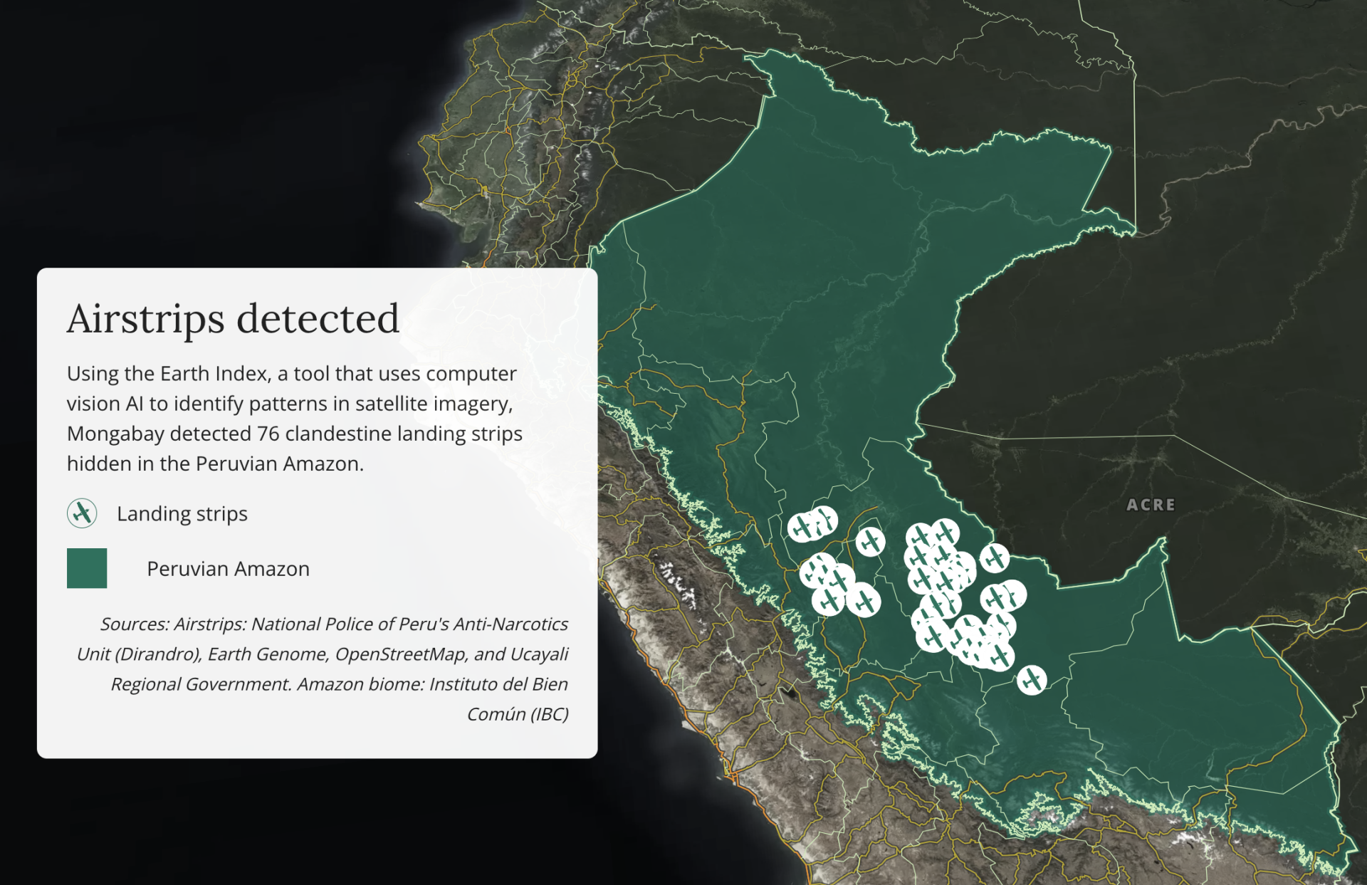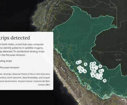 Mongabay’s Latin America team (Mongabay Latam) used AI tools to scour satellite imagery cross-referenced with official sources and on-the-ground observations plus interviews to detect 67 illegal airstrips used for transporting drugs in the Peruvian regions of Ucayali, Huánuco and Pasco. Thirty-one of those were concentrated in Atalaya, which has become one of the most violent provinces in the Amazon. Most of these recently constructed airstrips are located in and around Indigenous communities, whose members often object to their presence, leading to the killings of 11 Indigenous leaders and community members, though that number is known to be higher, as some killings have gone unreported to avoid retribution.