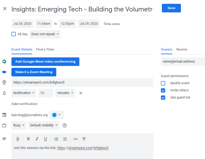 You will receive a calendar invite from Brian Duff, learning@journalists.org, a few days before your ONA presentation. Your calendar invite will include a link to join your session presentation via StreamYard.